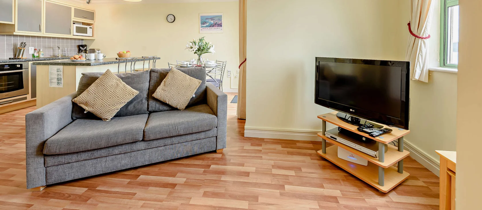 The open-plan sitting room and diner is centred around a Smart TV and comfortable sofas, with a dining table for four soaking up those glorious sea views. Step outside onto the private balcony terrace, where a bistro set for two invites you to savour your morning coffee with the bay as your backdrop. You also have access to a communal garden with outdoor seating and equally breathtaking views. The two bedrooms include a king-size master and a twin room, both with wardrobe storage, while a family bathroom with bath and overhead electric shower completes the apartment.