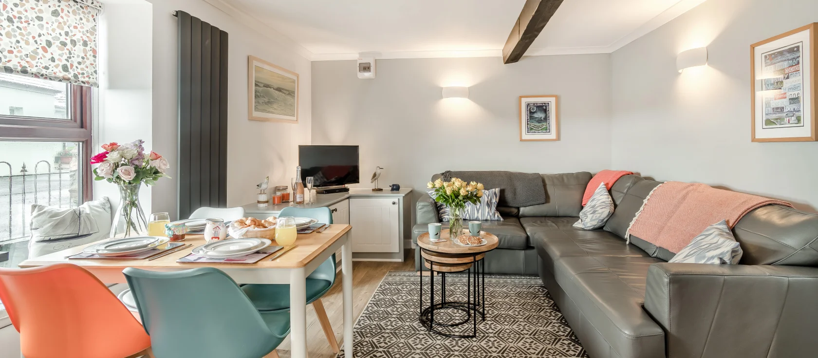 Coach House, Broad Haven is a contemporary ground-floor coastal apartment positioned less than 100 metres from Broad Haven's expansive golden sands, perfect for families, water sports enthusiasts, and coastal walkers alike. The open-plan lounge, kitchen and dining area creates a sociable space where a large corner sofa and coffee table invite relaxation after days spent exploring, while the dining table for four overlooks the waterside, ideal for leisurely meals with sea views. The well-equipped contemporary kitchen features a gas oven and hob, microwave, fridge with freezer compartment, Nespresso coffee machine, and dishwasher.