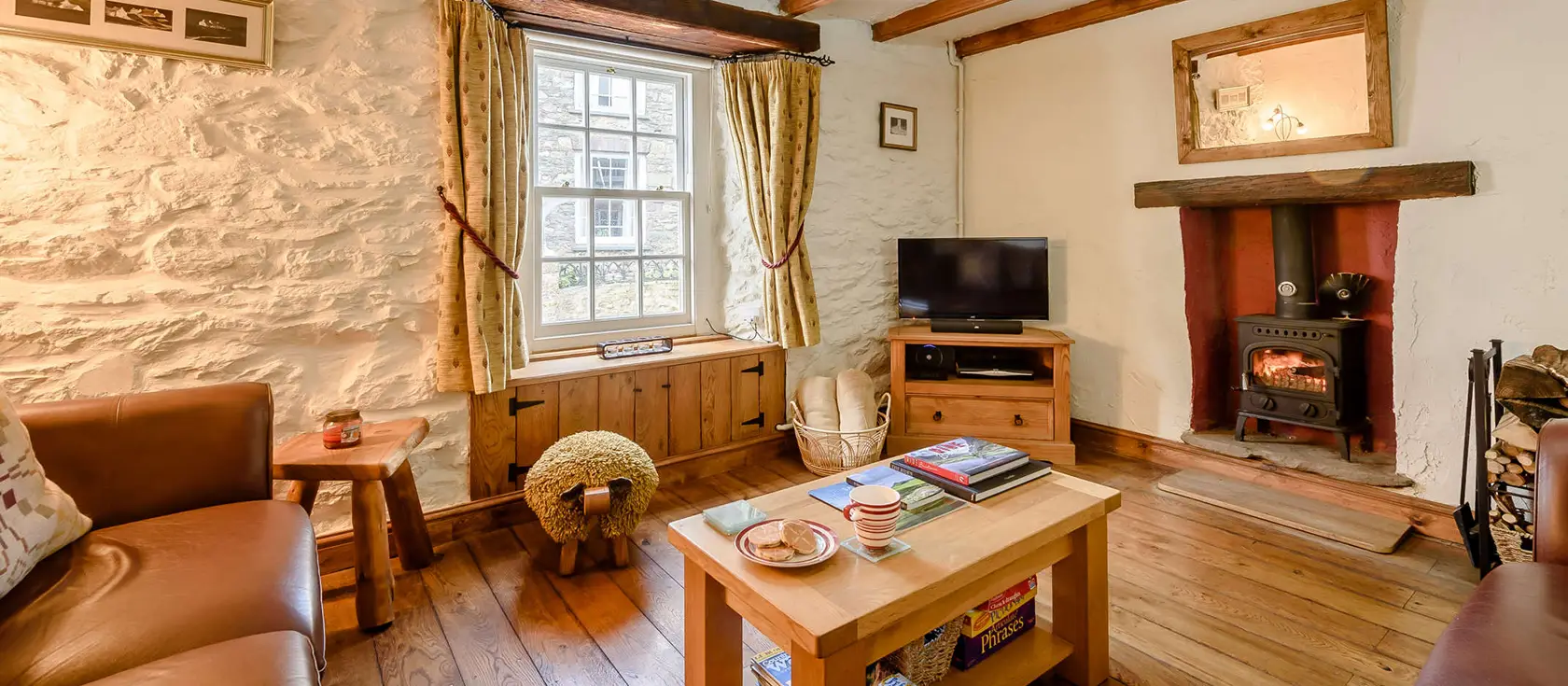 Bwthyn Clyd, St Davids, is a charming Grade 2 listed stone cottage brimming with character and original features. The open-plan shaker-style kitchen is beautifully equipped with an electric oven and hob, microwave, fridge / freezer, and washing machine, alongside a dining table perfect for leisurely breakfasts with freshly brewed Tassimo coffee. Step through to the inviting lounge, where beamed ceilings frame comfortable leather sofas and a cosy wood burner creates the perfect retreat after a day's exploration, complemented by a Smart TV with Netflix and Amazon Prime for relaxing evenings.