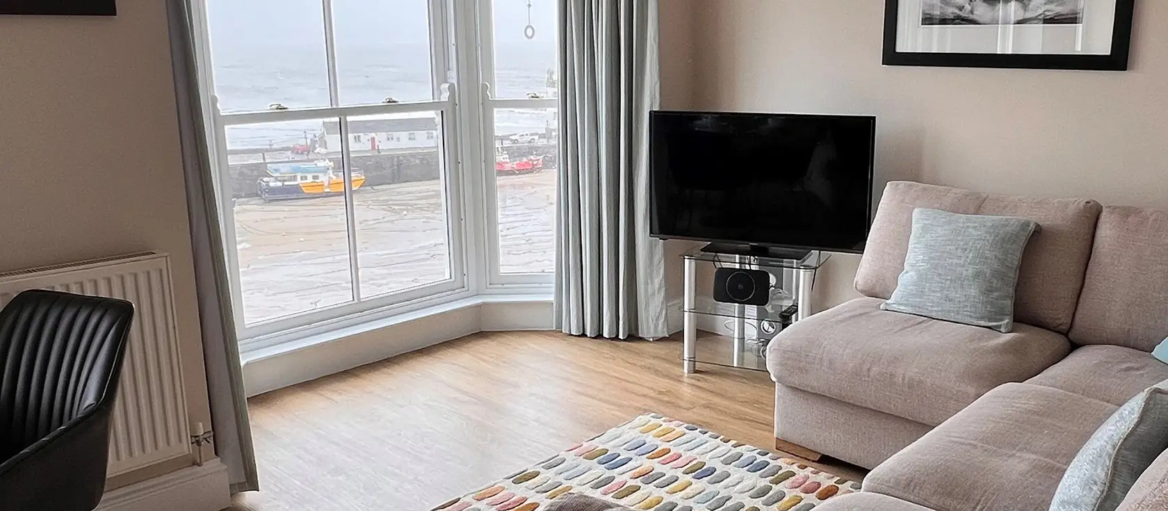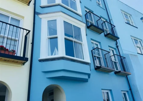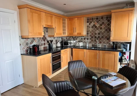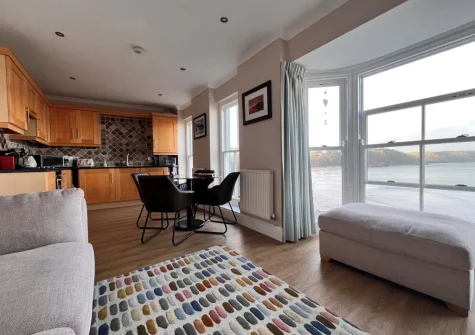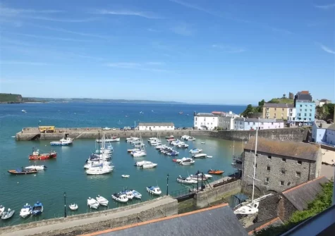 2 Goscar Court, Tenby is a delightful first-floor apartment offering a prime harbourside location with stunning sea views. The modern kitchen is well-equipped with an electric hob, oven, fridge, microwave, dishwasher and washer/dryer, providing everything you need to prepare delicious meals with ease. The heart of the home is the open-plan lounge / kitchen / diner, flooded with natural light and dominated by a large bay window and sash windows that frame spectacular views across the harbour and North Beach. Settle onto the inviting corner sofa with a glass of wine and let the coastal vistas provide the perfect backdrop to your evening relaxation.