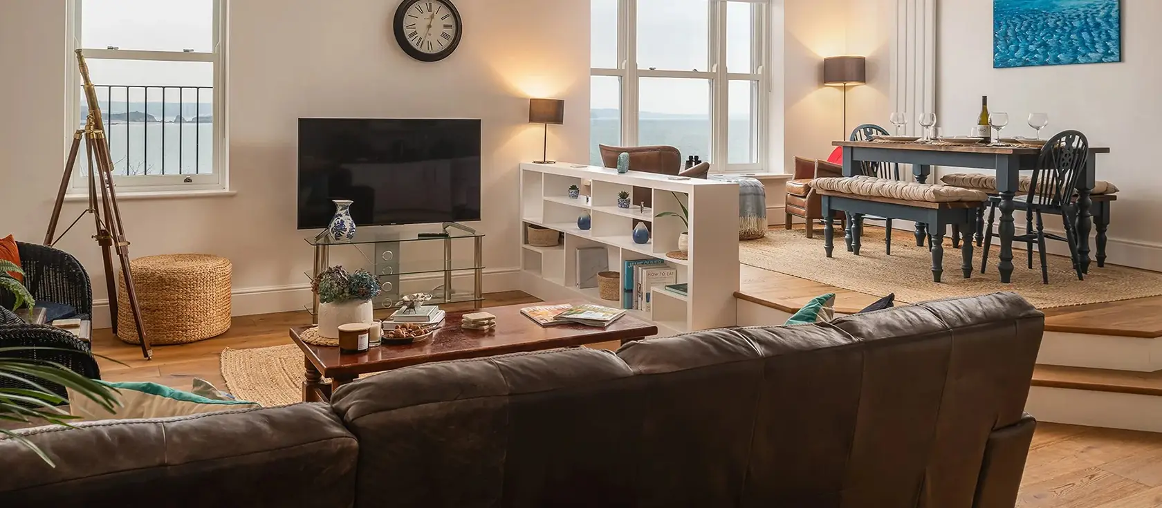 3 Newbridge House, Tenby is a charming three-bedroom maisonette offering elegant coastal living in Tenby's picturesque harbour town. The chic kitchen features a large cooking range with gas hob and electric ovens, complemented by a fridge, freezer, dishwasher, and washer / dryer. A wine cooler and Nespresso machine complete this well-appointed space, perfect for memorable meals. The bright, airy open-plan living area showcases soothing coastal ambience with fantastic sea views across the harbour, North Beach, and coastline. Comfortable sofas invite you to settle with a book or film, whilst the raised dining area provides a sociable setting to enjoy meals with views. A breakfast bar offers a convenient spot for quick bites.