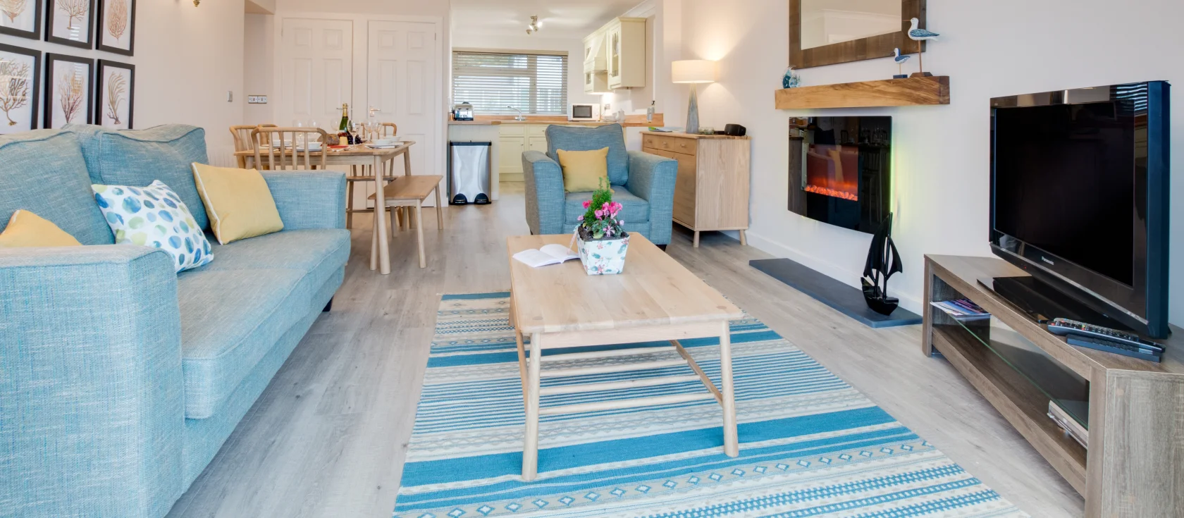 3 Strandways Court, Saundersfoot is a light-filled ground-floor apartment occupying an enviable position on The Strand, moments from Saundersfoot's golden sandy beach and vibrant harbour. The open-plan living area features a well-equipped galley kitchen with electric hob and oven, microwave, and washing machine – everything you could need for , flowing seamlessly into a comfortable lounge with sofas, armchairs, and Smart TV with Freeview. A dining table seats the family, while patio doors invite you onto your private sun terrace.