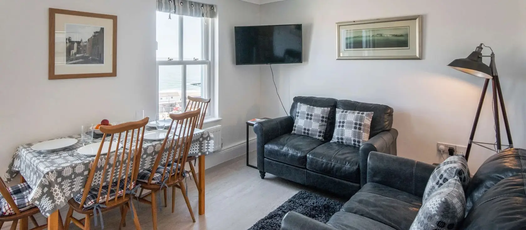 Relax in the comfortable living area and enjoy a film on the Smart TV whilst sipping chilled wine and gazing at sea views. The apartment offers two bedrooms: a double with an en-suite shower room, and a pretty twin with two comfortable single beds. A main bathroom with corner bath and WC ensures comfort for all. Though there's no dedicated outside space, the location puts you within easy reach of Tenby's vibrant beach culture, eateries, and charming shops. Parking is available in nearby public car parks within half a kilometre.