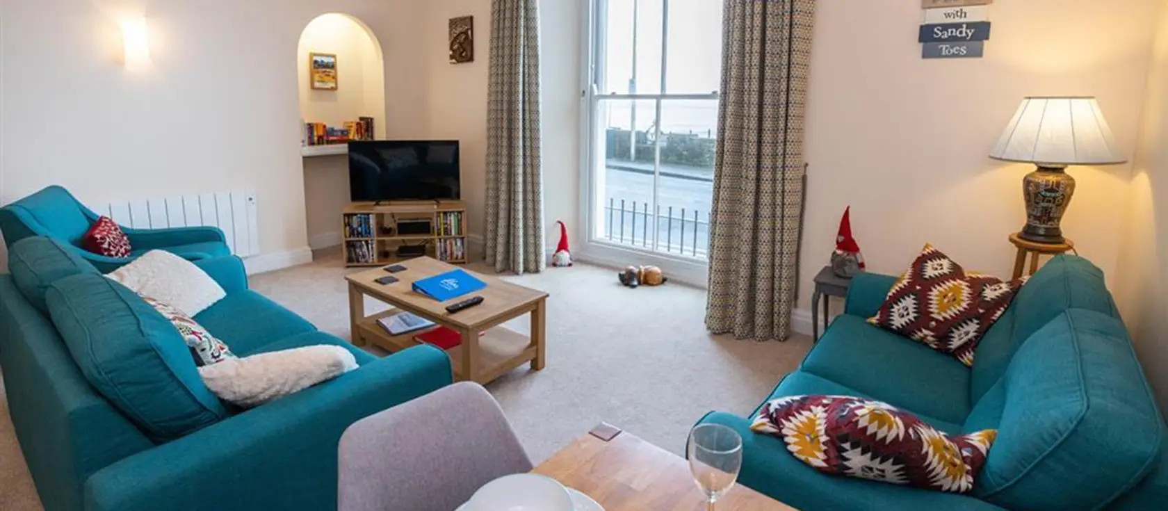 6 Richmond House, Tenby is a charming ground-floor apartment nestled above Tenby North Beach, offering a warm family-friendly retreat with contemporary-style interiors and cheery pops of colour. The bright, well-equipped kitchen features an electric oven and hob, a fridge with ice compartment, microwave, and washing machine, making meal preparation effortless. The spacious open-plan dining and living area floods with natural light, providing the perfect setting for enjoying breakfast with a view or settling in for a cosy evening with loved ones.