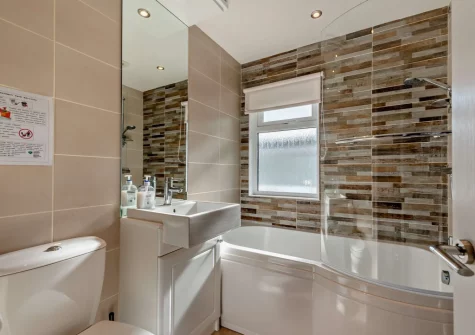 64 Heritage Park, Stepaside is a welcoming three-bedroom lodge nestled within peaceful Pembrokeshire countryside, offering a comfortable retreat for families and friends. The contemporary kitchen is well-equipped with an electric hob, oven, fridge / freezer, microwave, dishwasher, and washing machine, with a breakfast bar for casual dining. The spacious open-plan lounge / kitchen / diner showcases high ceilings and elegant furnishings warmed by an electric fire, inviting you to settle onto plush sofas and watch television. Floor-to-ceiling windows and patio doors flood the space with natural light, creating a bright, airy atmosphere perfect for relaxation.