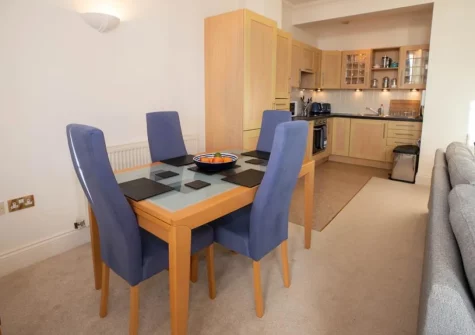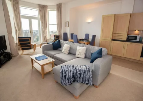 9 Bryn Y Mor, Tenby is a charming three-bedroom apartment set within an impressive Victorian building, seamlessly blending period character with contemporary comfort. The fully equipped kitchen features an electric hob, oven, fridge, freezer, microwave, washing machine and dishwasher, making meal preparation effortless. The bright, inviting open-plan lounge, kitchen and dining area, dressed in light, restful tones, offers the perfect space to relax and gather together. A Juliet balcony overlooks the town with distant sea views, whilst comfortable seating, TV and DVD create your ideal retreat after a day of exploring.