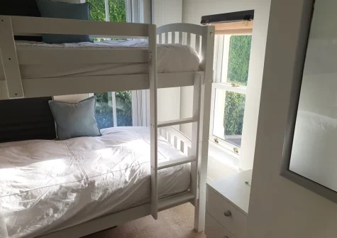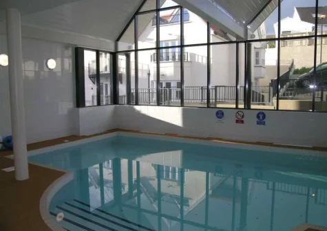 This elevated ground-floor property grants exclusive access to superb shared on-site amenities: a heated indoor swimming pool, sauna and fully equipped gymnasium with changing and shower rooms. The property comprises three generously appointed bedrooms—a king-size room with an en-suite shower room, a comfortable double room, and a bunk room with distant sea views, perfect for families. A family bathroom with shower over bath and WC ensures comfort for all guests.