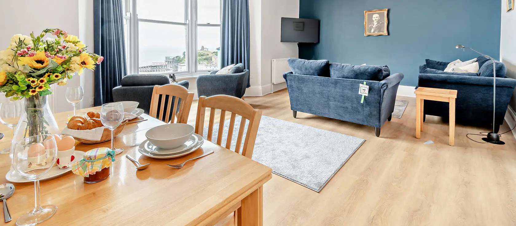 Beach Retreat, Tenby, is a beautifully refurbished second-floor apartment offering a sophisticated coastal escape with spectacular sea views. The contemporary kitchen is fully equipped with an electric oven and hob, dishwasher, microwave, and fridge-freezer, perfect for preparing delicious meals. The open-plan lounge, kitchen, and dining area is bathed in natural light from the stunning period bay window, which frames breathtaking views of North Beach and the historic harbour. Two sumptuous sofas are positioned around the wall-mounted Smart TV and DVD player, while two armchairs nestle in the bay window – ideal for watching the world go by.
