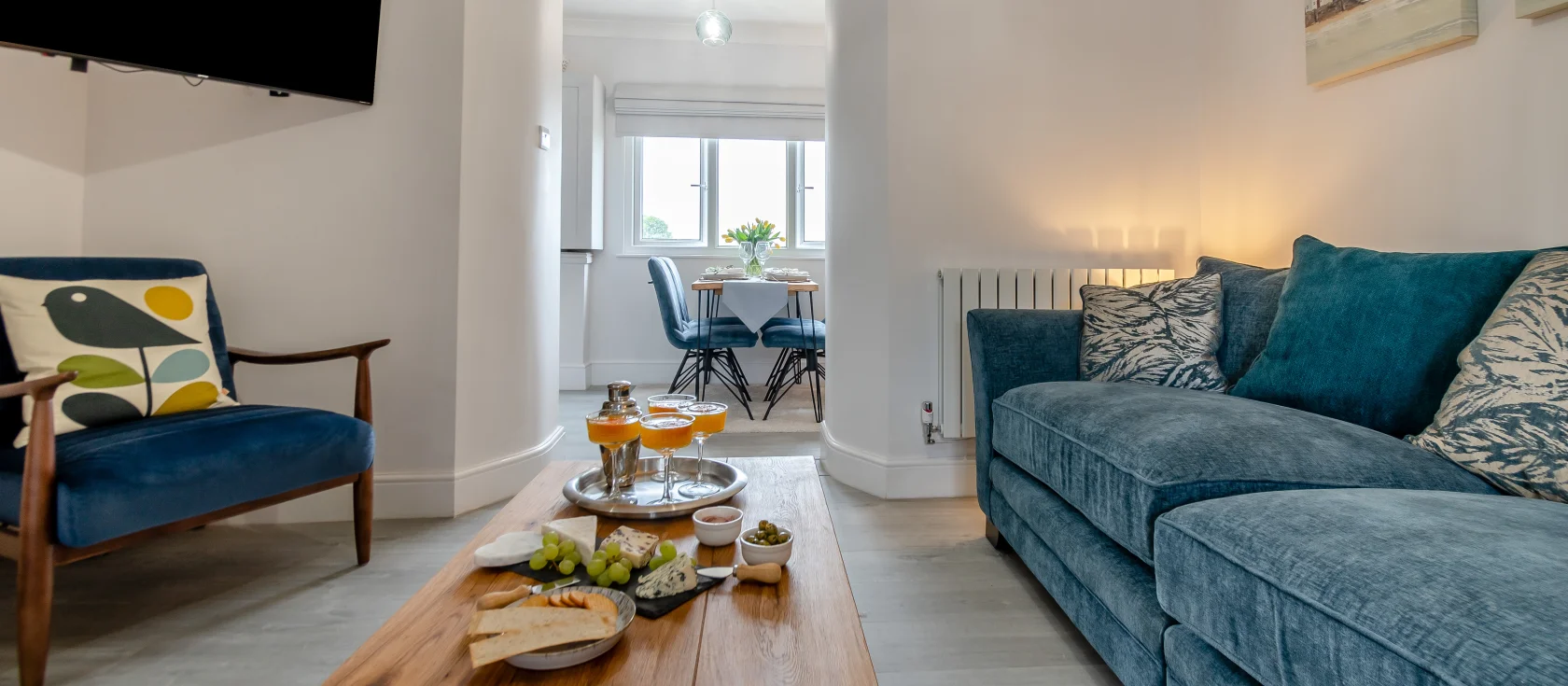 Cove Apartment, Tenby is a beautifully presented second-floor apartment perfectly positioned just outside the Medieval town walls and only 300 metres from North Beach's golden sands. The open-plan living space welcomes you with comfortable seating arranged around a Smart TV, ideal for cosy evenings after busy days exploring the coast. Through an archway, the galley-style kitchen provides everything needed for self-catering breaks, including built-in oven and ceramic hob, dishwasher, microwave, and Dolce Gusto coffee machine for leisurely morning brews. The bright dining area sits opposite the lounge, flowing through to the spacious master bedroom.