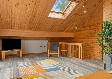 The lodge features two comfortable bedrooms on the ground floor and a family bathroom. Ascend the stairs to discover the main living area, a perfect spot to relax after a day of exploration. The master bedroom, complete with an ensuite, is also located on this floor, offering a private retreat for the parents.