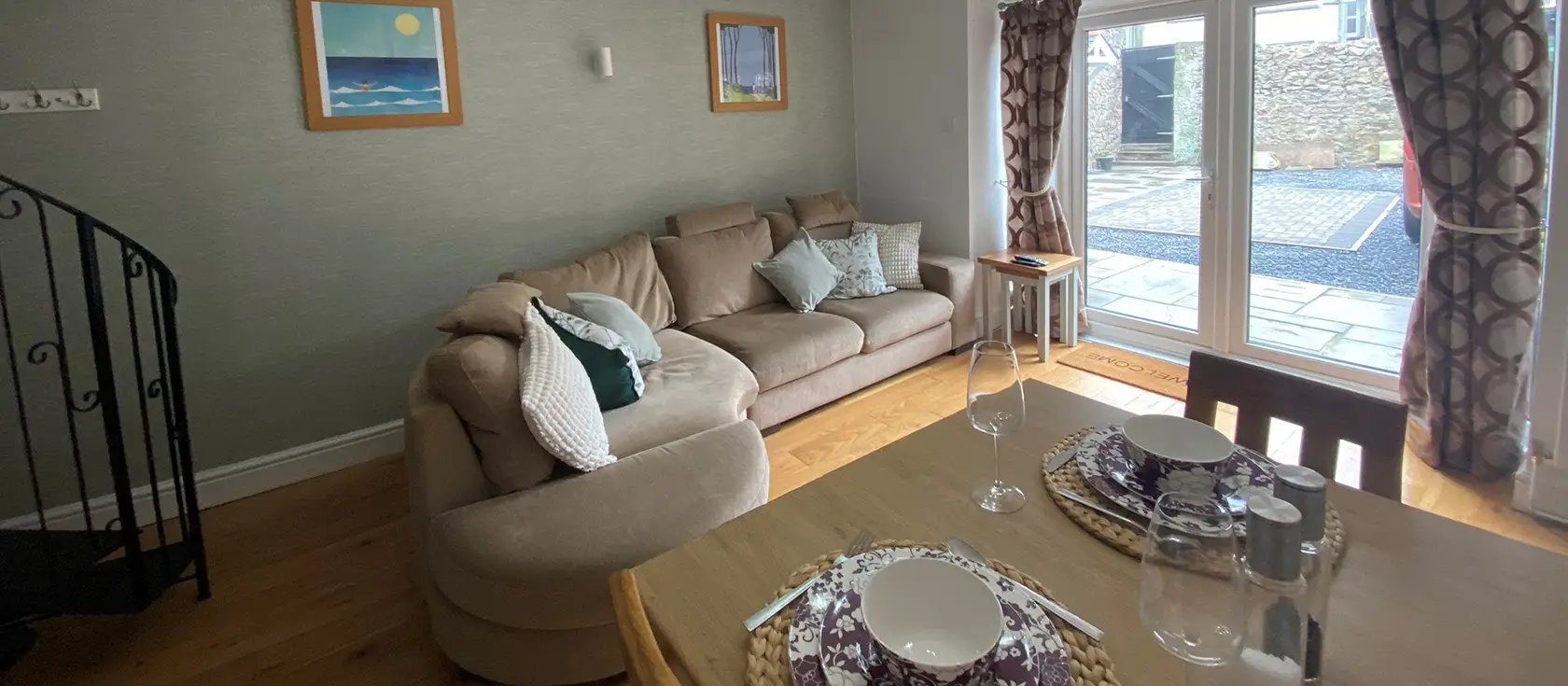 Green Cottage Coach House, Tenby is a charming romantic retreat, perfectly positioned for couples seeking a seaside escape without compromising on home comforts. The compact kitchen invites culinary creativity, featuring a gas oven and hob, a microwave, and a fridge / freezer—everything you need to prepare delicious meals using locally sourced ingredients from your coastal wanderings. The open-plan lounge / kitchen / diner is your cosy sanctuary, with comfortable sofas for relaxation and a television for quieter evenings. French doors open directly onto the courtyard garden, creating an effortless connection between intimate interior living and the outdoors.