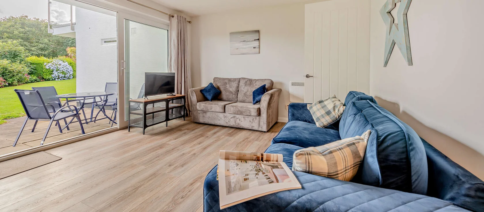 Heading outside, the private enclosed patio accessed directly from the lounge creates a delightful spot for morning coffee or evening drinks, complete with garden furniture and space for one dog to join the family holiday. Private parking for one car adds welcome convenience to your seaside escape. Two bedrooms provide restful accommodation: a double room with soothing coastal décor and a twin room perfect for children or friends sharing. The modern bathroom features a shower cubicle, wash hand basin, and WC.
